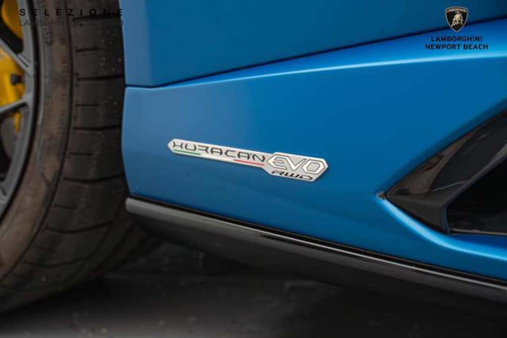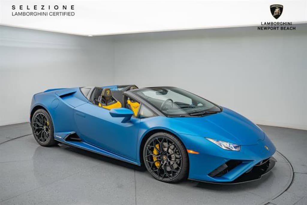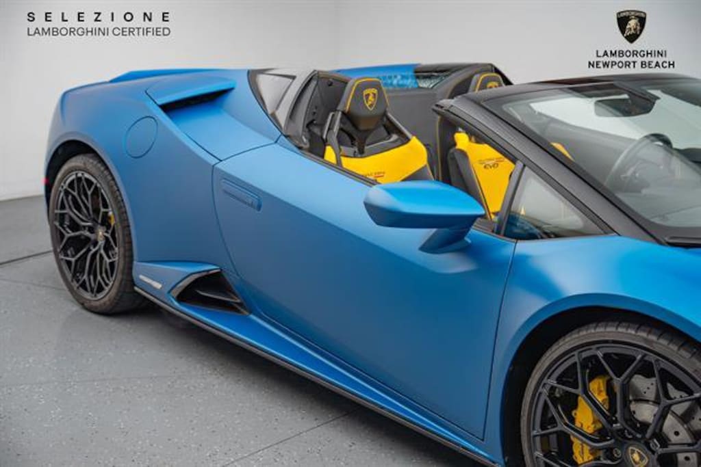 RareBlu Mehit matte paint!!This 2020 Lamborghini Huracan EVO Spyder painted in the stunning "Blu Mehit" exterior over a "Nero Ade" leather interior is an open-top supercar that pairs dramatic styling with serious performance. It's powered by a 5.2-liter naturally aspirated V10 engine that produces 610 hp and 560 Nm (413 lb-ft) of torque, delivering the thrilling sound and sharp response the Hurac   n is known for. This combination of vivid color, refined cabin, and powerful V10 performance makes the EVO Spyder an unforgettable driving experience.Our Service Department has performed the CPO and Safety inspection as well as REPLACED THE CABIN AND ENGINE AIR FILTERS, CARBON CANNISTER, 6TH YEAR SERVICE.This Example Features:20-Inch Forged Wheels Painted in a Gloss Black FinishYellow Painted Brake CalipersFront End Paint Protection FilmAd Personam Custom Exterior PaintSport SeatsLamborghini Sensonum Sound SystemRear Bumper in High Gloss BlackEVO-TRIM SportivoStyle Package in High Gloss BlackSmartphone InterfaceTechnology PackEmbroidered Lamborghini HeadrestRoof Lining and A Pillars in LeatherWindscreen Frame in High Gloss BlackCruise Control SystemAmbient Light PackageDynamic Power SteeringFloor Mats with Leather PipingLifting System +Contrast StitchingSelezione Lamborghini Certified Pre-Owned Details:* Vehicle History* Limited Warranty: 12 Month/Unlimited Mile* 150+ Point Inspection* Roadside Assistance* Transferable Warranty* Warranty Deductible: $0All Pre-owned cars bought from us get 25% off our in-house full car PPF and 20% of all other PPF. We buy cars and accept all trade-ins, no matter how cheap or expensive!! For a no obligation offer call, click or stop by. 714-617-9807 or https://www.lambonb.com/sell-my-car-irvine-ca/#form3Please be sure to ask about our Ceramic Coating, Clear Bra, Black Out Packages, Wheel and Tire Packages, Tint, Extended Warranty and Maintenance, Wheel and Tire protection, Windshield and Key replacement packages.Lamborghini's 150-Point Safety Inspection has been completed by our Factory Certified Technicians. We offer available leasing and financing options as well as the Lamborghini Selezione Certified Pre-Owned Warranty and can help arrange transportation worldwide.For further information, please call, e-mail, or visit our world-renowned showroom at 44 Auto Center Drive inside the Irvine Auto Center Monday through Friday 8AM to 5PM and Saturdays 10AM to 5PM. *Please contact dealership for vehicle location. Vehicle may be off premises.*Certified Pre-Owned